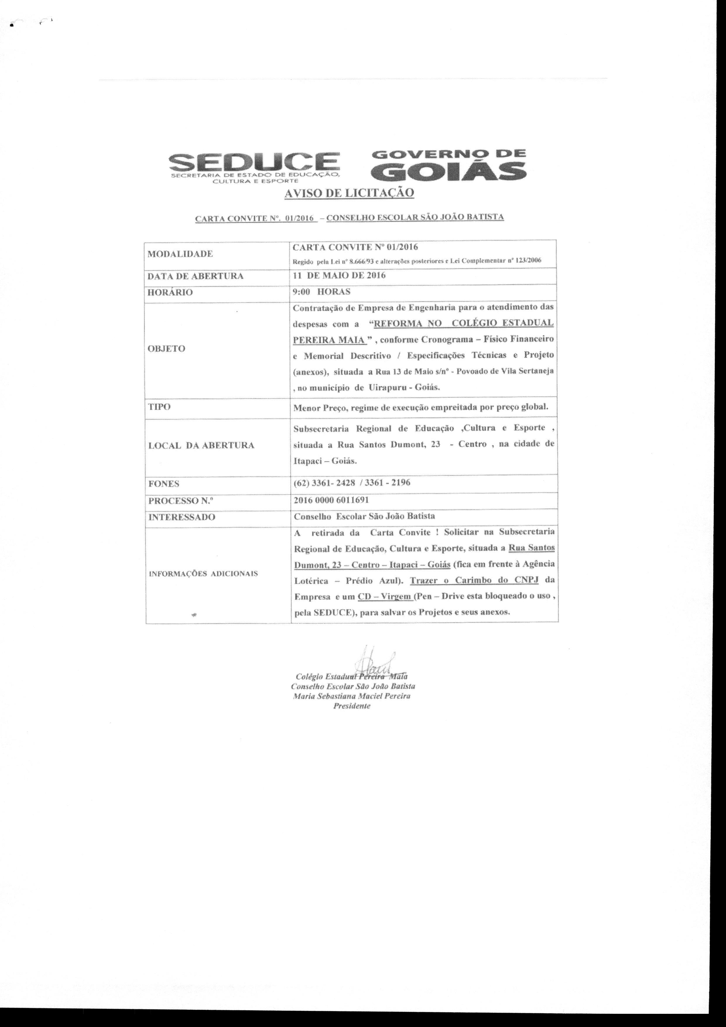 EDITAL CARTA CONVITE Nº 001/2016 UIRAPURU