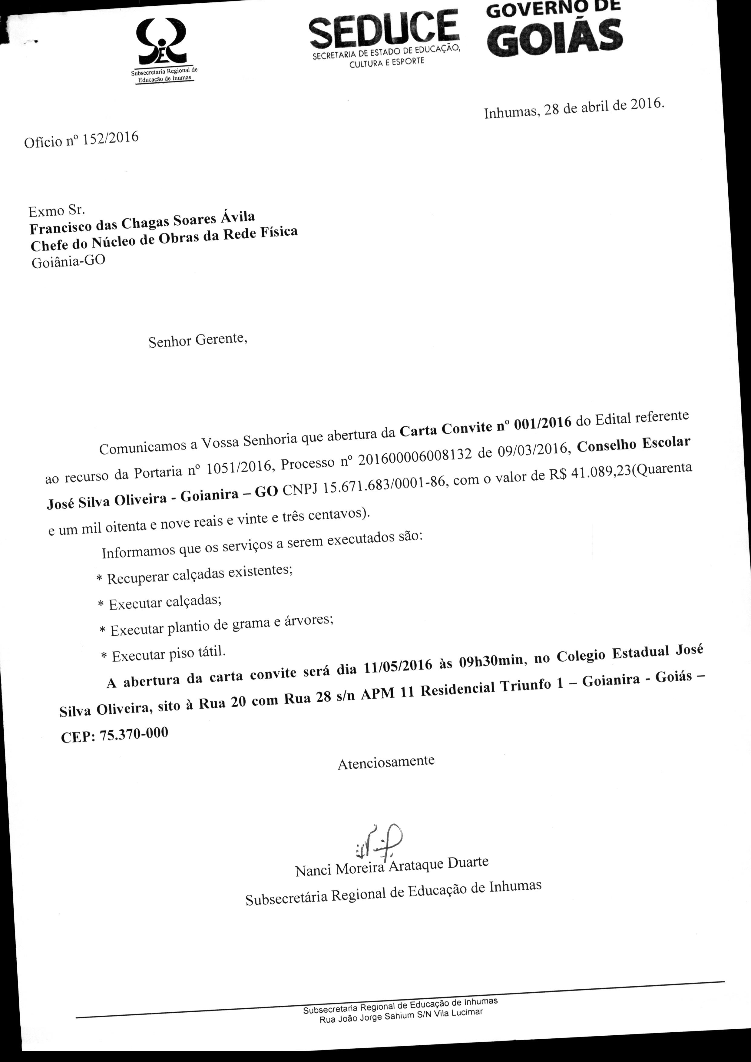 EDITAL CARTA CONVITE Nº 001/2016 GOIANIRA